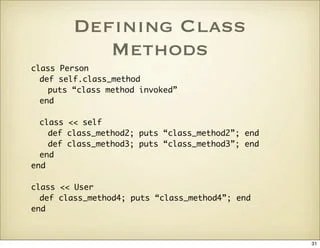 Ruby Class Method Self / Extending Ruby With C David Grayson Las Vegas Ruby Meetup Ppt Download - One feature of ruby that makes it such a good fit for frameworks like rails is that you can execute arbitrary code inside class and module .